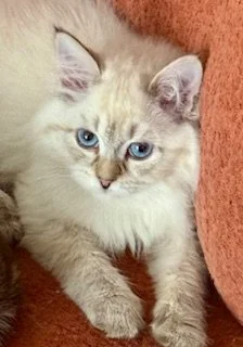 Princess Masha — female Siberian Neva Masquerade kitten, born 10/02/2025. Striking blue eyes, plush pointed coat. Playful, affectionate, intelligent, and well-socialized. age-appropriate health checks and vaccinations.